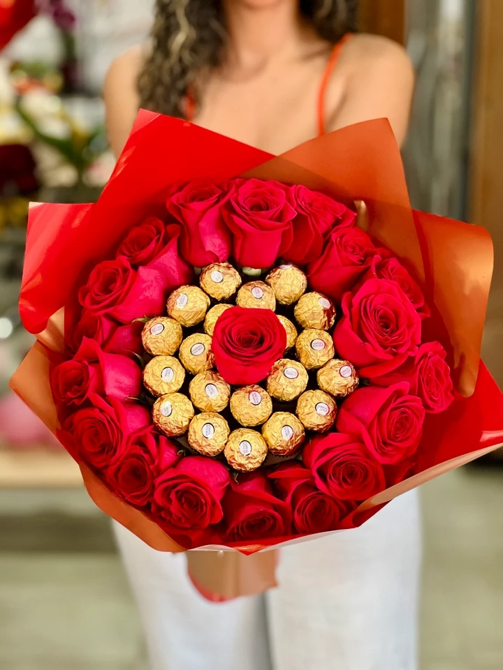 Quando palavras não são suficientes, este presente fala por você. Um deslumbrante buquê de rosas vermelhas, símbolo clássico de amor e paixão, combinado com uma generosa caixa de Ferrero Rocher, o chocolate perfeito para momentos inesquecíveis. Tudo cuidadosamente pensado para criar uma experiência cheia de romantismo e sabor.