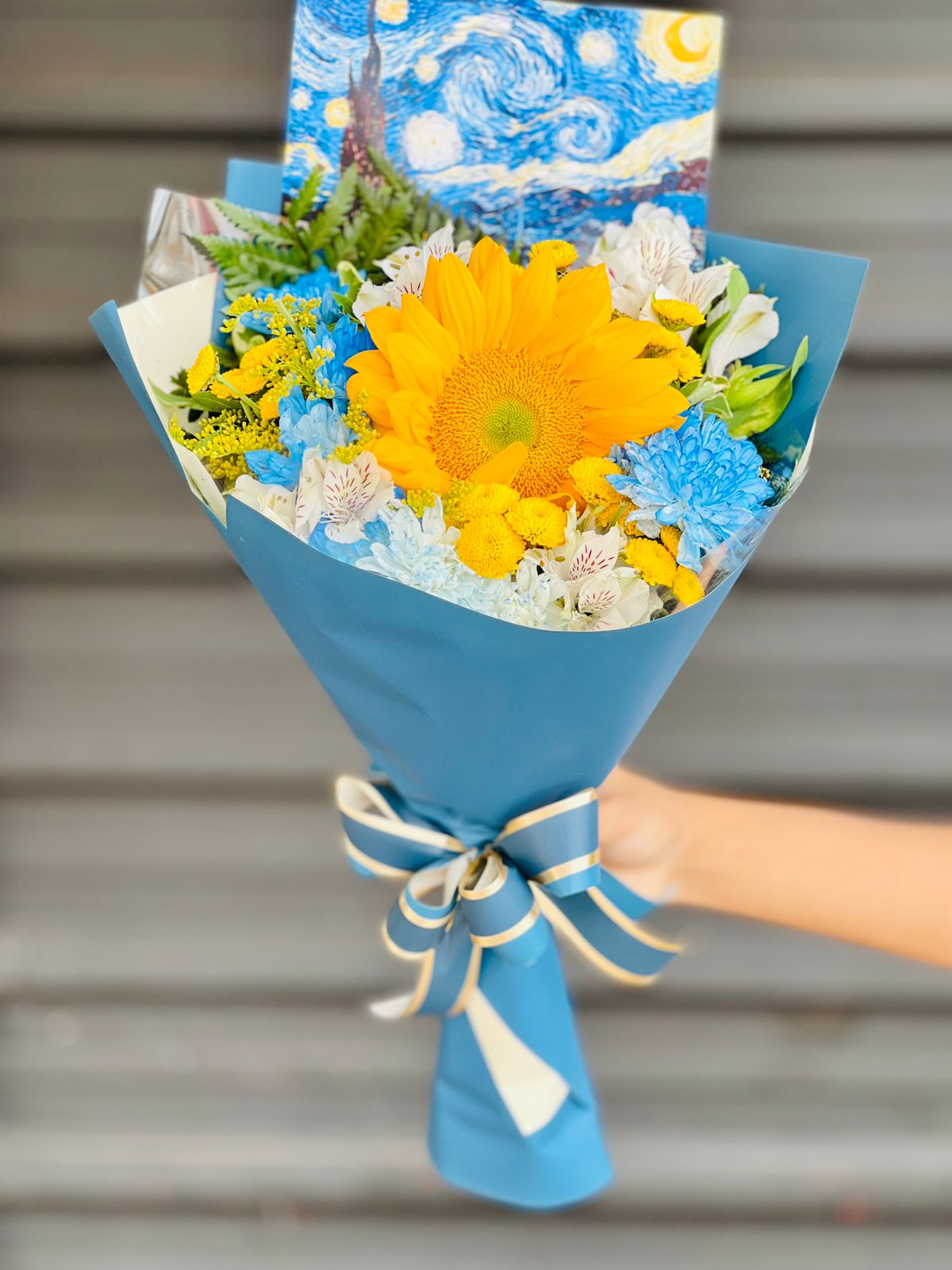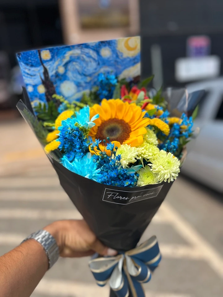 Inspirado nas obras de um dos maiores artistas de todos os tempos, o Buquê Van Gogh combina a vibração e a intensidade das cores com a delicadeza das flores. Composto por girassóis radiantes, folhagens cuidadosamente selecionadas e embalado com elegância, este arranjo é uma verdadeira obra de arte que celebra a vida, a luz e a criatividade.